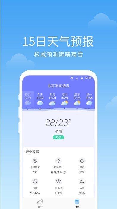 1、未来空气质量,预报未来15天空气状况,及时丰富和掌握综合空气信息。